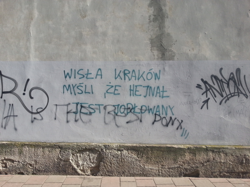 :D Na Zamku w kasie kupujemy za 7 zł ulgowy bilet który upoważnia do wstępu na dzwon Zygmunta i do Grobów Królewskich. Jednak najpierw trochę chodzimy po dziedzińcu. W końcu nadszedł czas, wchodzimy do Katedry Wawelskiej, powoli zwiedzamy te prześliczne obiekty wchodzimy do Grobów oczywiście zdjęć stamtąd nie ma z powodów oczywistych. Następnie idziemy na dzwonnicę: I tego nie rozumiem za nic w świecie. Co trzeba mieć w głowie, aby przy tak pięknym zabytku pisać na deskach markerem kocham cię Aniu? No co?! Pomijając ten fakt i sporą gimnastykę przy wchodzeniu po schodach było ok. Potem znowu wracamy na stare miasto. Kupujemy całodobowy bilet za 7,50 zł i lecimy na stadion Cracovii, gdzie za kilka godzin rozegrała ona spotkanie z górnikiem Łęczna. Potem Błonie Niestety na kopiec Kościuszki nie starczyło czasu. Wracamy do miasta, napełnić manę i życie na galę, więc trzeba było zjeść kebaba!